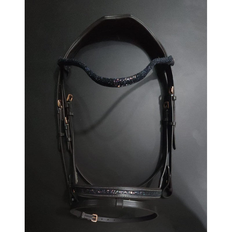 On retrouve notre galon Disco noir ou bleu marine sur le frontal à clip, la muserolle et les rênes.