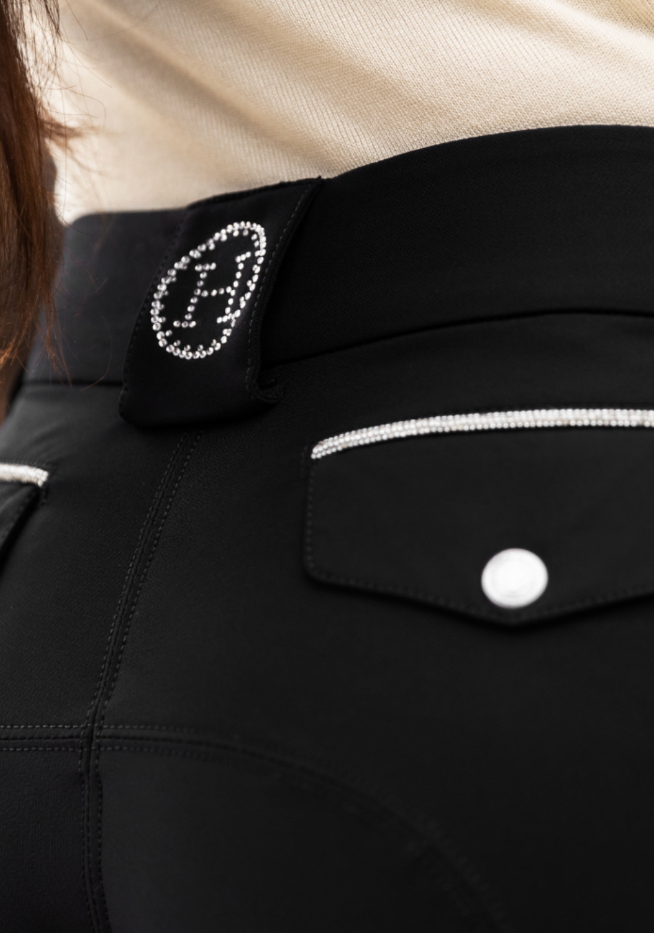 - Deux fausses poches arrière à rabats avec liseré strass au dos du pantalon