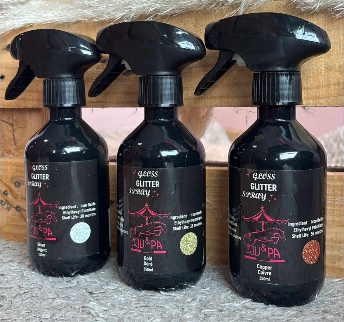 Spray glitter argent, cuivre ou doré pour faire briller votre cheval.